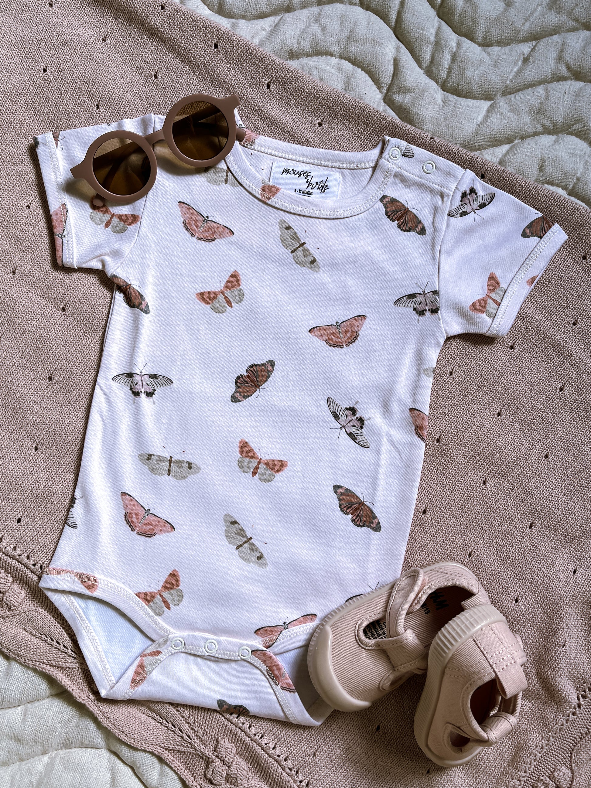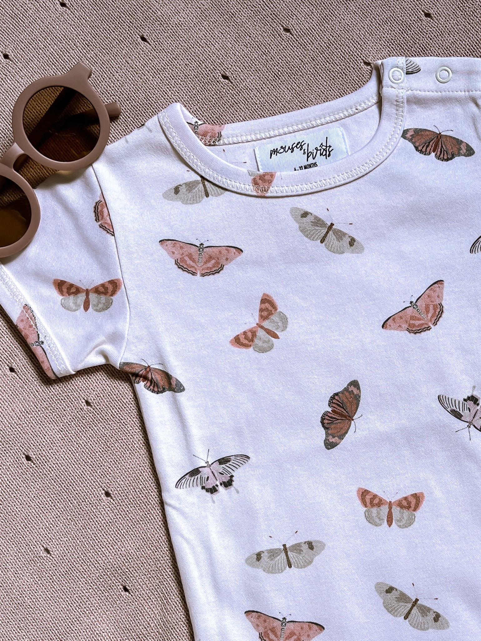 Our Short-Sleeved Bodysuit features the sweetest hand-illustrated butterflies on a subtle blush pink background. Made from 100% high-quality cotton, this comfy, breathable style has snap buttons at the side collar and crotch for easy dressing and nappy changes.