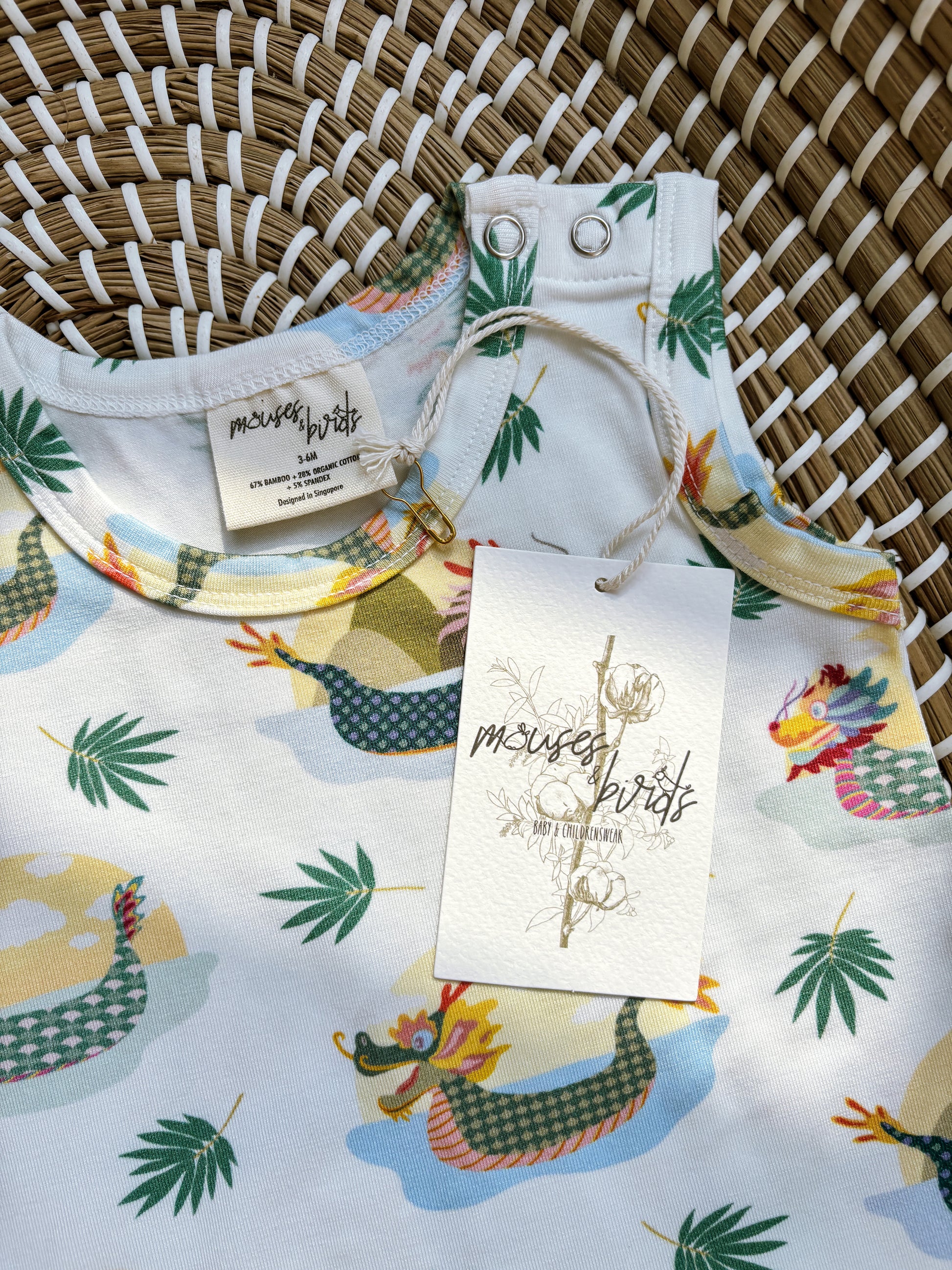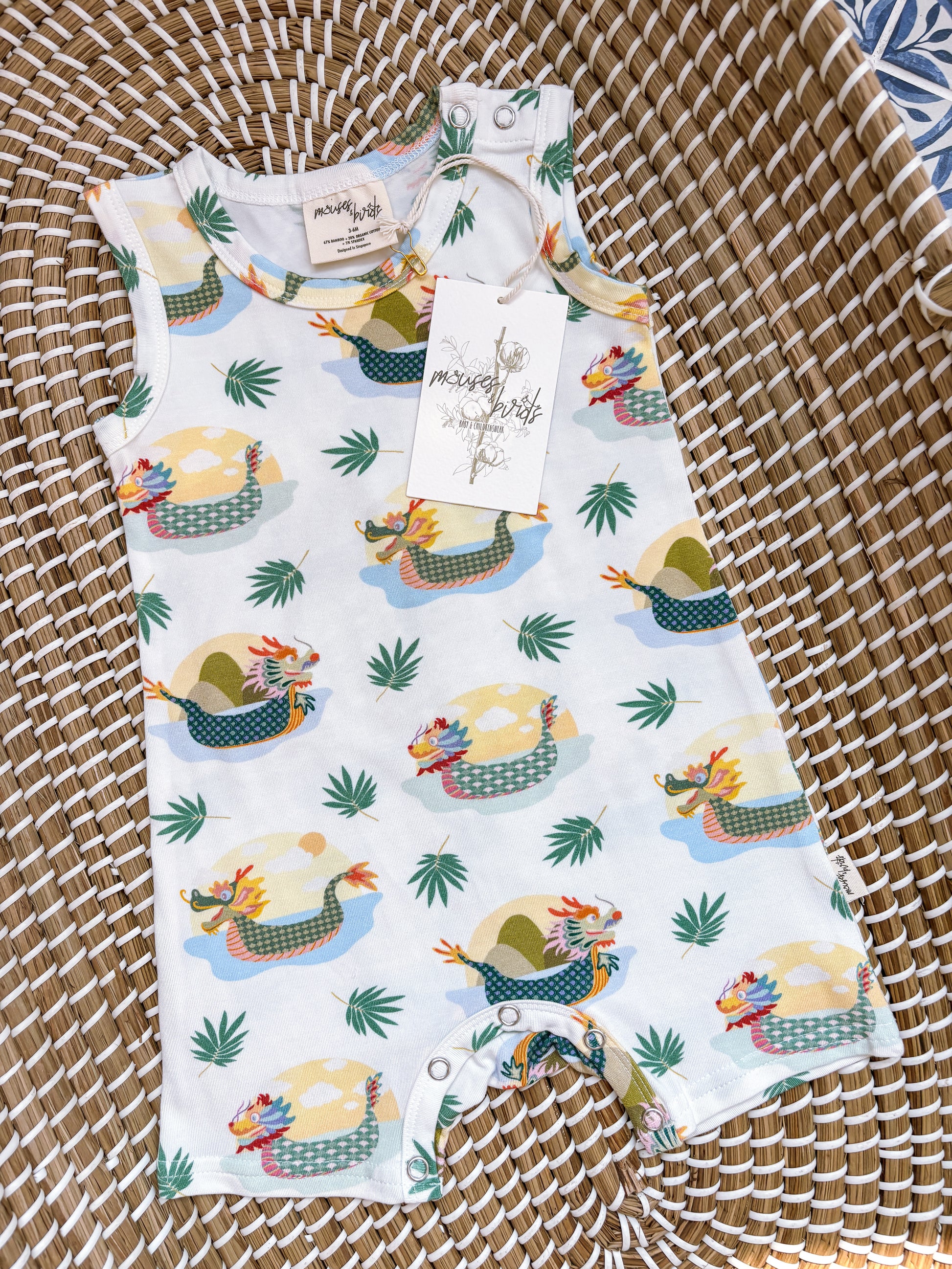 This Sleeveless Boyshort Romper features an all-over Dragonboats print. Dragon boats are long, narrow boats decorated to look like a Chinese dragon, used for racing in the Dragon Boat Festival, a traditional festival in Singapore!
